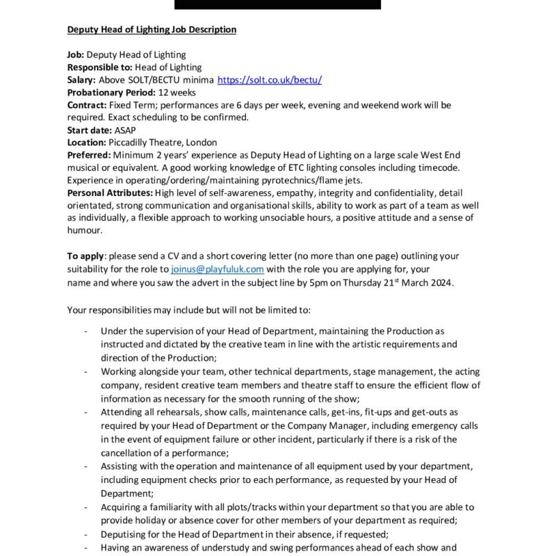 Deputy Head of Lighting Job Description 2024