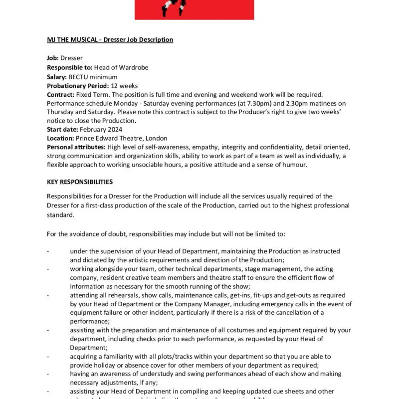 Dresser Job Description- MJ The Musical
