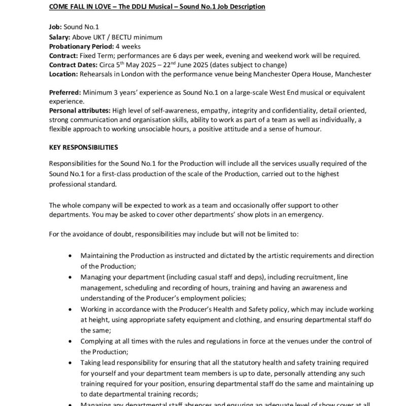 HOD Sound Job Description – Come Fall In Love