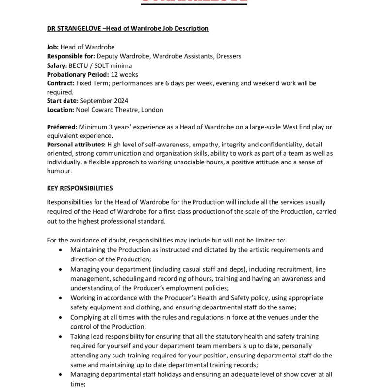 HOD Wardrobe Job Description- Dr Strangelove