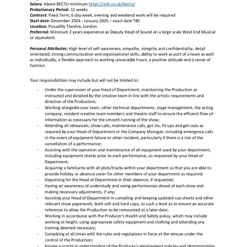 MRWE Deputy Head of Sound Job Description