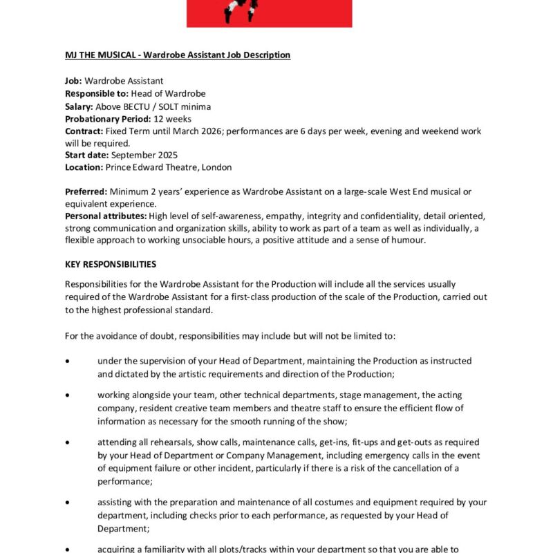 Wardrobe Assistant Job Description- MJ The Musical August 2025