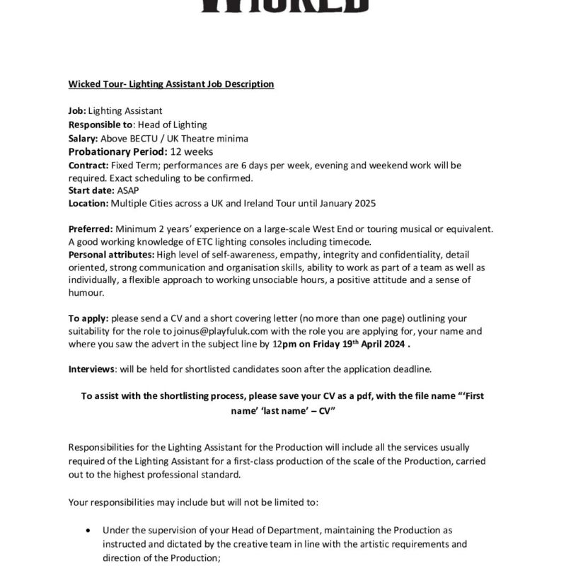 Wicked Tour- Lighting Assistant Job Description